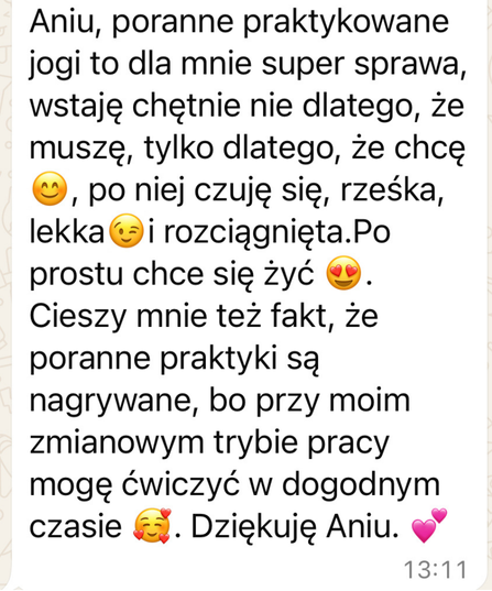 Bo poranki mają w sobie ciszę, spokój i moc. To moment, w którym łatwiej usłyszeć siebie, poczuć ciało i zadbać o wewnętrzną harmonię. Nawet 30 minut regularnej praktyki potrafi zmienić bardzo wiele – bez konieczności reorganizacji całego dnia.